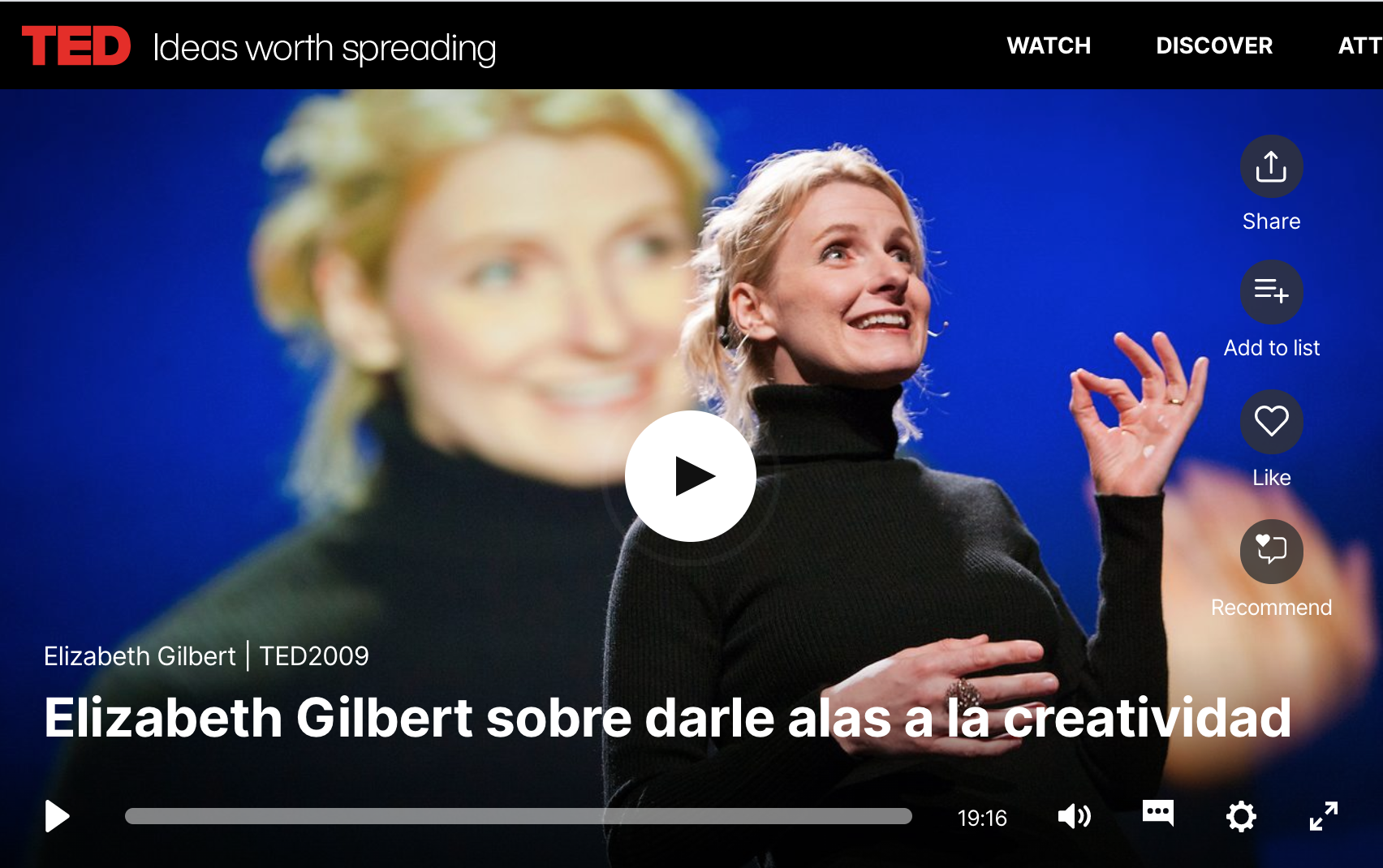 Me encanta la charla que dio en TED la escritora Elizabeth Gilbert. No he leído su famoso libro que después sirvió de inspiración para la película que lleva su mismo nombre, “Come, reza, ama”. Lo leeré en cuanto pueda porque la sensibilidad, calidez, cordura y humildad que transmite en la charla me han despertado la curiosidad sobre qué nos quiere contar en él y cómo lo hará.